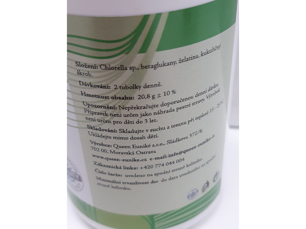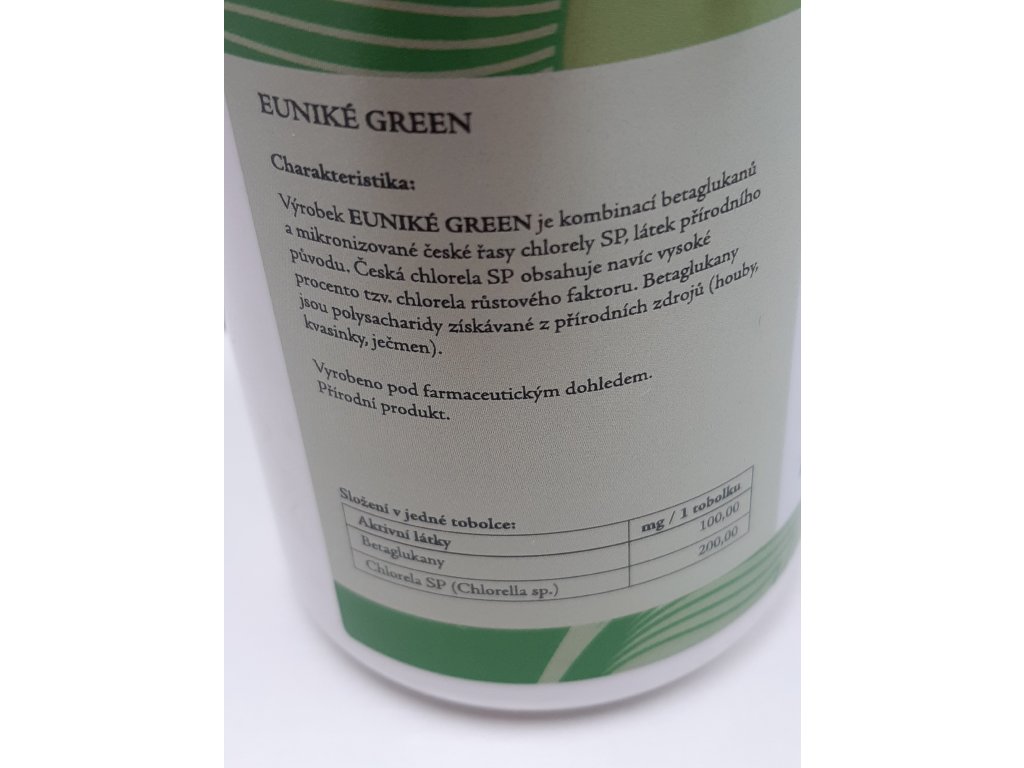 Charakteristika: Produkt EUNIKÉ GREEN je kombinací betaglukanů a mikronizované české řasy chlorely SP, látek přírodního původu. Česká chlorela SP obsahuje navíc vysoké procento tzv. chlorela růstového faktoru. Beta glukany jsou polysacharidy získávané z přírodních zdrojů (houby, kvasinky, ječmen).