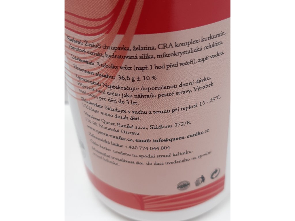 Složení: Žraločí chrupavka, želatina, CRA komplex: kurkumin, chmelový extrakt, hydratovaná silika, mikrokrystalická celulóza.
