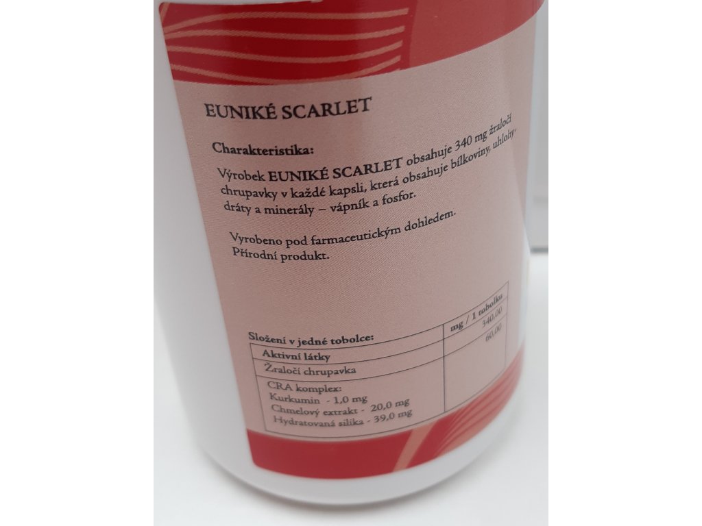 Charakteristika: Výrobek EUNIKÉ SCARLET obsahuje 340 mg žraločí chrupavky v každé kapsli, která obsahuje bílkoviny, uhlohydráty a minerály – vápník a fosfor.