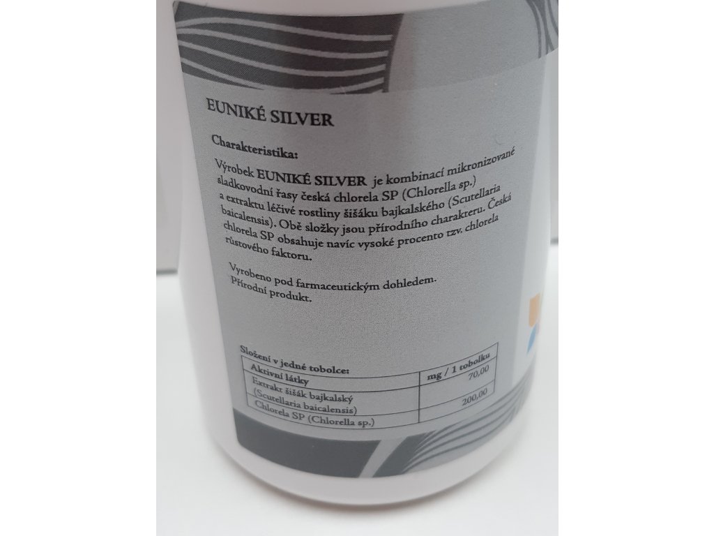 Eunike Silver je osvědčený produkt, který obsahuje vyváženou kombinaci aktivních látek, sladkovodní řasy - české chlorelly, chlorela sp a léčivé rostliny šišáku bajkalského.